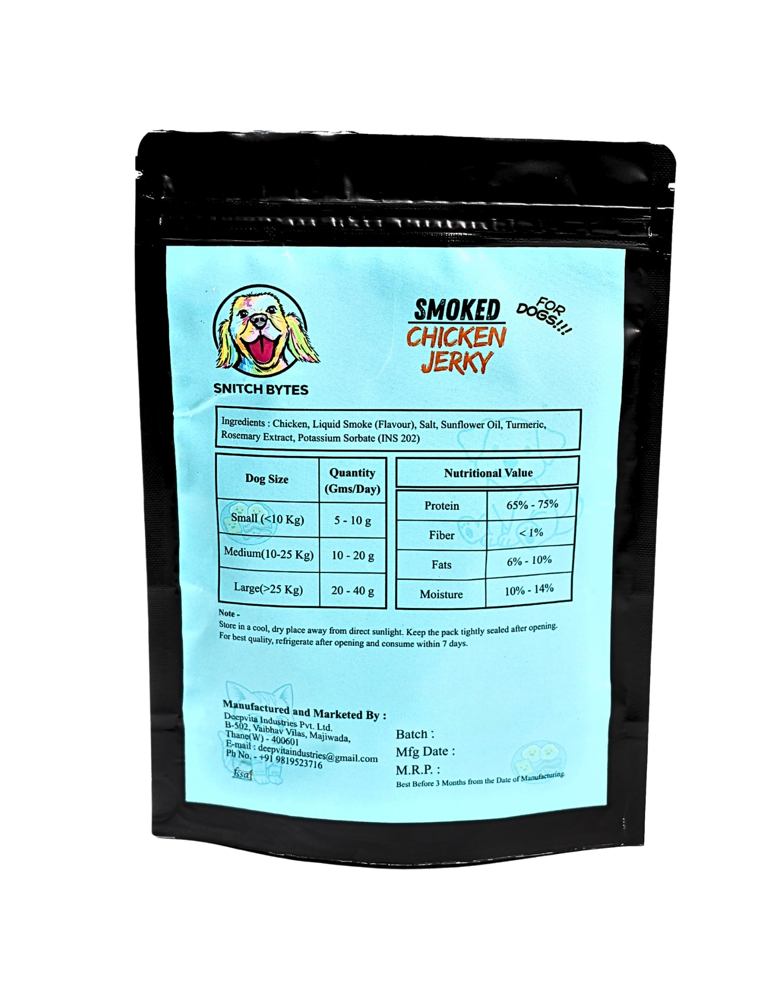 A rich, savoury treat made from real chicken, gently smoked and slow-dried for an irresistible aroma and taste dogs love. Snitch Bytes Smoked Chicken Jerky is thoughtfully prepared to deliver a bold, meaty flavour — perfect for dogs who enjoy something a little extra special during treat time.